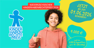 Unter dem Motto "Ich kenne meine Rechte" zeichnen das Land Niedersachsen und der Kinderschutzbund Niedersachsen auch in diesem Jahr wieder Aktionen aus, die sich für die Verwirklichung der Kinderrechte einsetzen. Ab sofort bis zum 1. Juni 2026 können Kinder und Jugendliche sowie Kitas, Schulen, Sportvereine, Gemeinden und Jugendverbände ihre Beiträge einreichen. Der Preis ist 2026 mit insgesamt 12.000 Euro dotiert. Zusätzlich gibt es dieses Jahr einen Sonderpreis zum 18. Geburtstag! Eine Jury unter Mitwirkung junger Menschen legt fest, welche Aktionen ausgezeichnet werden. Im Rahmen der Preisverleihung im Nachgang zum Weltkindertag in Hannover am 26. September werden die Preisträger:innen für ihren ganz besonderen Einsatz ausgezeichnet.